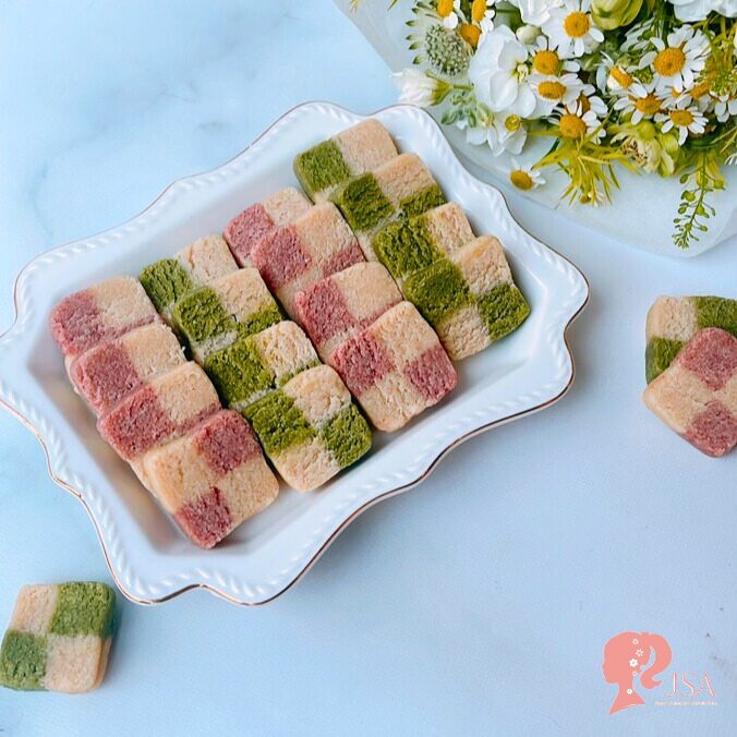 こちらで作成したプレーン&抹茶味のロークッキー生地を成形・5~6枚にカットし、